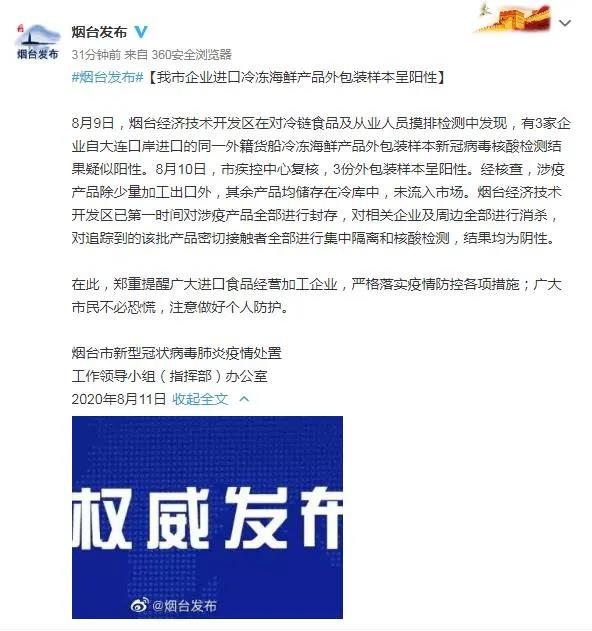 8月10日,煙臺市疾控中心復核,3份外包裝樣本呈陽性。經核查,涉疫產品除少量加工出口外,其余產品均儲存在冷庫中,未流入市場。煙臺經濟技術開發區已第一時間對涉疫產品全部進行封存,對相關企業及周邊全部進行消殺,對追蹤到的該批產品密切接觸者全部進行集中隔離和核酸檢測,結果均為陰性。
